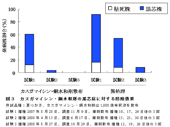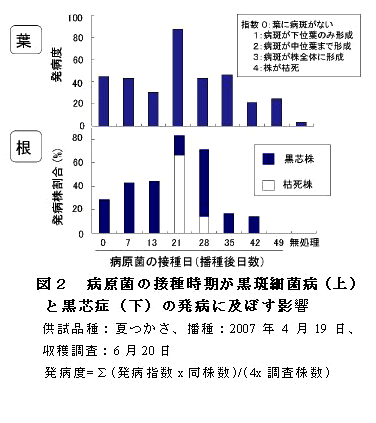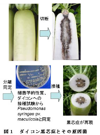 ダイコン根内部の黒芯部から Pseudomonas syringae pv. maculicolaが分離され、分離細菌を接種すると黒芯症(根部)と黒斑細菌病(葉部)が再現される。カスガマイシン・銅水和剤を3回散布することで黒芯症の発生が軽減できる。 | ||||||||