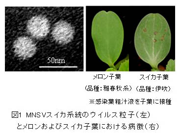 鳥取県のスイカから分離された本ウイルスは直径約30nmの球状ウイルスである。宿主範囲はウリ科植物に限られるが、既知のMNSVと異なり、メロン(品種:雅春秋系)では感染が認められない(図1)。 |