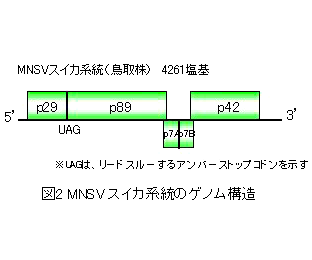 本ウイルスの全塩基数は4261で、5つのタンパク質遺伝子をコードしており、既知のMNSVとゲノム構造は同一である(Accession: AB232925)(図2)。 |