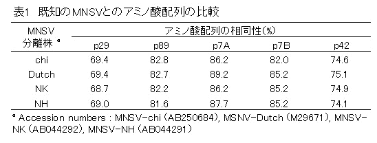 既知のMNSVとアミノ酸配列を比較すると、複製酵素(p89)は約82%、外被タンパク質(p42)は約75%の相同性である(表1)。しかし、MNSVが属するCarmovirus属ウイルスの分類基準(Virus Taxonomy, 8th report of ICTV, 2005)では、複製酵素と外被タンパク質の相同性がそれぞれ52%以下、41%以下が別種の基準であることから、本ウイルスは、MNSVの新系統(スイカ系統)である。 |