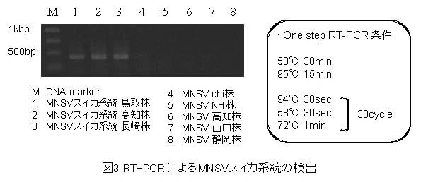 MNSVスイカ系統は、従来のMNSV抗体では検出が困難なため、本RT-PCRはMNSVスイカ系統の特異的検出・同定に有用である。 |