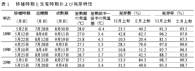 但し、登熟期の気温が高くなると移植時期にかかわらず発芽勢が低くなる場合があるので、適切な乾燥や加温処理により発芽勢を高めることを検討する。(表1)。