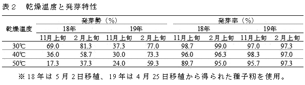 30℃で乾燥することにより発芽勢、発芽率の向上が期待できる(表2)。 |