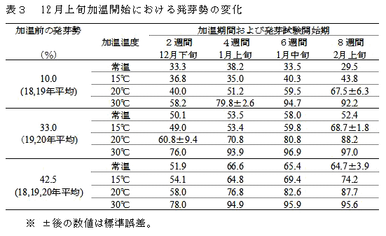 この場合、発芽勢が10%程度の種子は20℃で8週間または30℃で4週間、30%程度の種子は15℃で8週間または20℃で2週間加温することにより、目的の発芽勢を確保できる(表3)。