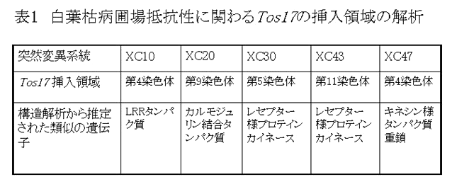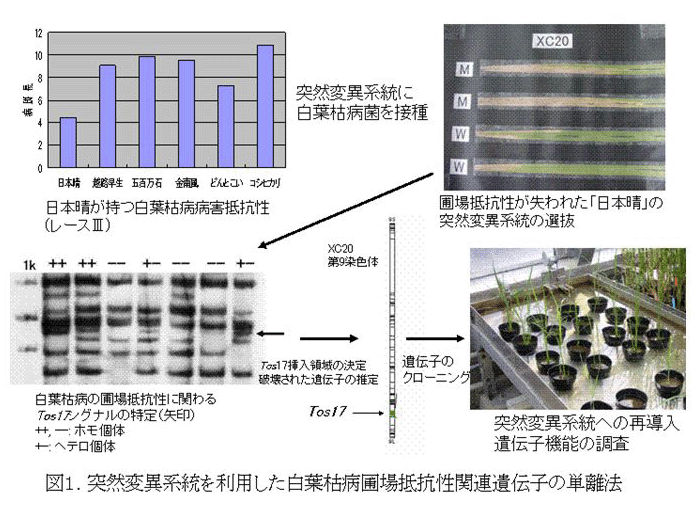 圃場抵抗性は機能の類似した多数の遺伝子の集積効果であるため、白葉枯病圃場抵抗性を構成する遺伝子の単離には Tos17 を用いたタギング法が有効である。 |