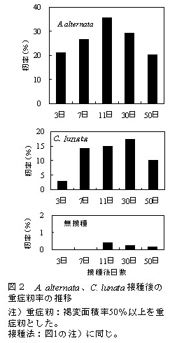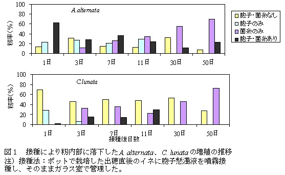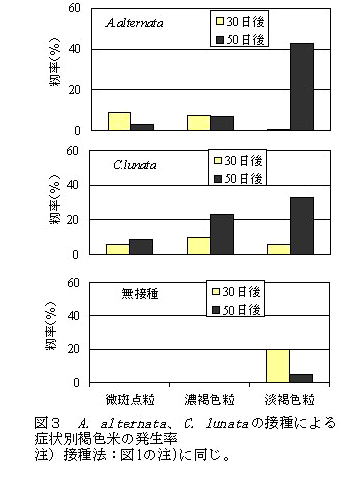 褐色米を引き起こすAlternaria alternataは、開花期の籾内へ落下した直後から胞子が発芽し、菌糸が伸展する。同じくCurvularia lunataは、落下3日頃から胞子が発芽し、菌糸を伸展させる。両菌による褐色米は、30日後に出現する。 | ||||||||
