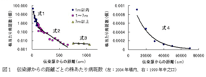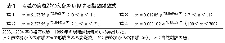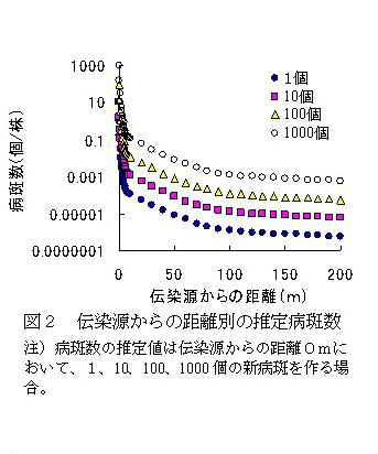 4種類の指数関数式を組み合わせた次式を使うと、発病程度が異なる伝染源からの距離別の病斑数が推定できる(図2)。