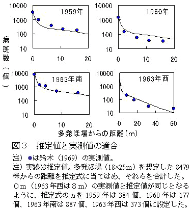 推定式で算出した病斑数は、鈴木(1969)の調査値と適合しており、近距離における推定精度は高い(図3)。 |