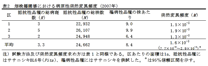 いもち病菌の病原性突然変異頻度は、水田圃場では4.7~8.8×10-5、畑晩播圃場では1.6×10-5である。圃場における突然変異頻度は、10-5のオーダーと推定される。 | ||||||||