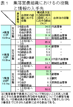 さらに、合併後の役職の配置も、特定の集落に集中させず、例えば、栽培担当と相互連携が必要な機械担当は異なる集落から選任する等、集落を横断している(表1)。 |
