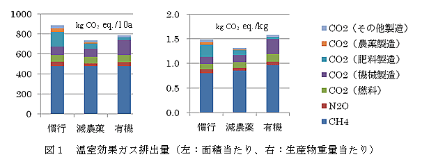 温室効果ガス排出量を面積当たりで比較すると、多い順で、慣行、有機、減農薬であり、生産物重量当たりで比較すると、有機、慣行、減農薬であった(図1)。面積あたりでも有機の方が減農薬よりも多い理由には、除草用機械の導入が関係している。また、排出量の内訳をみると、メタン(直接排出)がその半分以上を占めている。 |