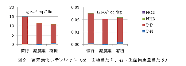 富栄養化ポテンシャルを面積当たりで比較すると、多い順で、慣行、減農薬、有機であり、生産物重要当たりで比較すると、慣行、有機、減農薬であった(図2)。環境影響の大半は、リンに由来するものである。 |
