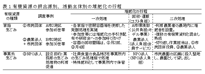 家庭生ごみの堆肥化とその農業利用を行う県内の代表的な2事例と、事業系の生ごみを市民農園に利用する新規の1事例について、運営者への聞き取り調査と、活動参加者のグループインタビューを実施すると、有機性資源の堆肥化と農地への利用の流れは図1のとおりとなる。いずれも排出源において一次処理を行った後に回収し、二次処理を行っていることがわかる(表1)。 |