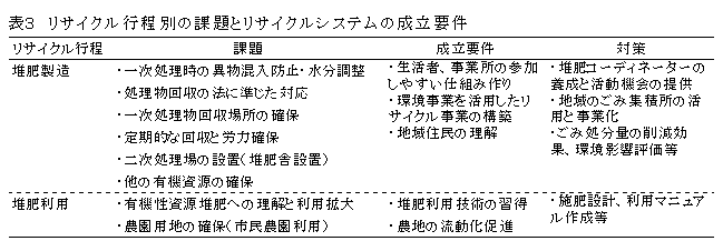 各団体には生ごみの資源化から農業利用までの活動全体を把握・運営している人材が存在し、リサイクルの円滑な運営のキーマンとなる。有機性資源リサイクルの課題として、堆肥製造では一次処理時の不純物の混入防止と効率の良い回収方法、農地利用では利用者の拡大があげられる。リサイクルシステムの構築には、排出者と利用者の両者の理解、生ごみ処理事業の有効活用および農地利用の促進による、環境と農政事業の活用が必要である(表3)。 |