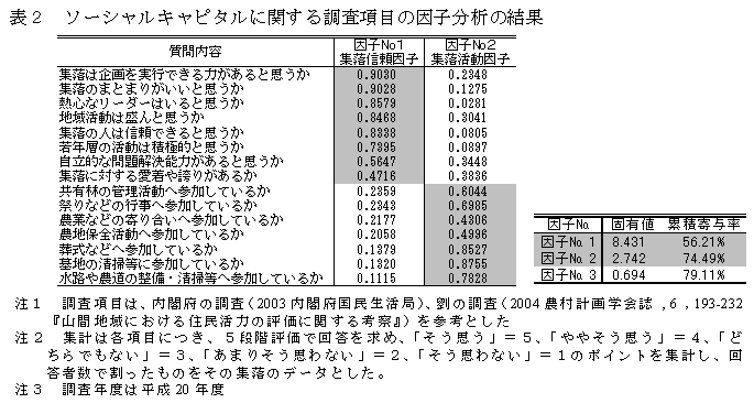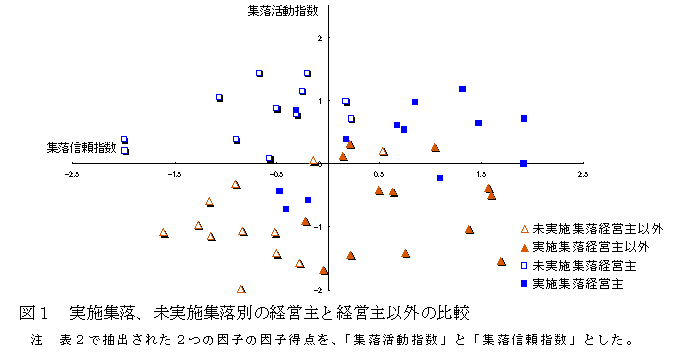集落営農に取り組むことは、参加農家にとって農地の保全や将来の農業経営に対する安心感、集落の結びつきや活力の向上など、経済のみでは測定できない効果もあると考えられる。しかし多くの場合、集落営農はコストや労働力等の経済・経営面を中心に評価され、安心感や集落の活力といった効果を定量化して評価した例は少ない。そこで、地域活力の測定等に用いられるソーシャルキャピタルの概念を用い、集落営農に取り組むことができた集落(以下実施集落)と集落営農未実施の集落(以下未実施集落)、それぞれの経営主と経営主以外の間のソーシャルキャピタルを測定し、集落営農への取組が集落の活力に及ぼす効果を考察する。 | ||||||