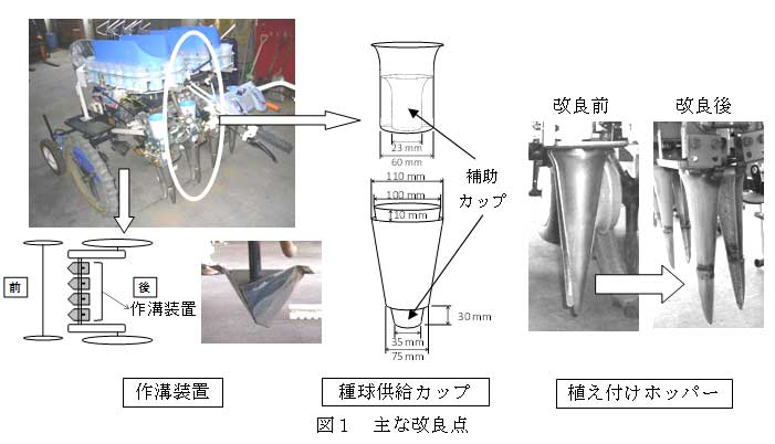 1. 上部と下部にある種球供給カップに補助カップを入れ、上部種球供給カップはφ60mmからφ23mm、下部種球供給カップはφ75mmからφ35mmにカップ形状を小さくすることで三年子ラッキョウが種球供給部から植え付け部に落ちる時の姿勢が安定する(図1、表1)。 |