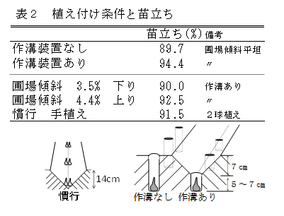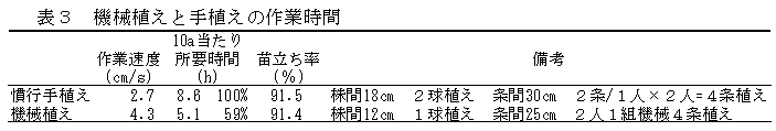 4. 10aあたりの所要時間は、手植え(2人組)が条間30cm、株間18cmの2球植えで8.6時間であるのに対し、機械植え(2人組)は条間25cm、株間12cmの1球植えで5.1時間で、約60%に短縮できる(表3)。 |