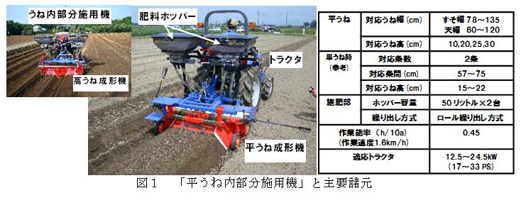 1うね2条の平うね栽培で肥料施用量を削減できる「平うね内部分施用機」