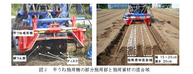 平うね成形機は耕うん部と平うね成形板からなる。野菜を1つの平うねに2条の露地野菜を栽培するため、耕うん部の耕うん軸には2枚のディスクが2組取り付けられている。2組のディスクの前方に施用された肥料はこのディスク間だけ土壌と混和される。混合される範囲は幅15~25cm(ディスク間で調節可)、深さ20cmである(図2)。 |