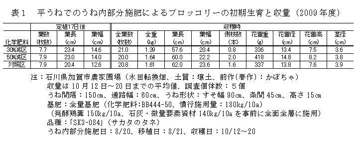 埼玉県、石川県の平うねや平うねにマルチを張ったブロッコリー栽培において、それぞれ現地実証試験を行った結果、基肥施用量を30~50%削減しても生育・収量は慣行施用量の場合と同等であり、遜色はない。また、初期生育が良好で、ブロッコリー等栽培期間が短い野菜では有効である(表1)。 |