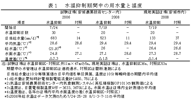 1. 出穂期以降の日平均気温が28℃を越え高温障害が予測される場合において、水田水温上昇の抑制は、高温障害対策の技術確立に有用である。