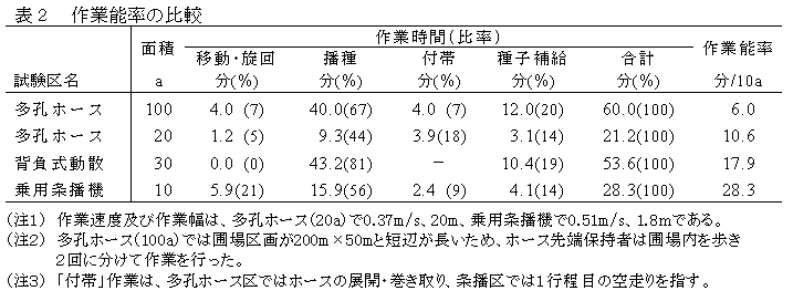 多孔ホースでは2人作業が基本となるが、1人当たりの作業能率では背負い式動散とほぼ同等となる。また、本法では圃場両端でのホース展開及び巻き取り等の付帯作業が必要となる。そのため圃場長辺が長いほど作業能率は高くなり、面積1haの大区画圃場で往復作業を行う場合の作業能率は6分/10a程度となる(表2)。 |
