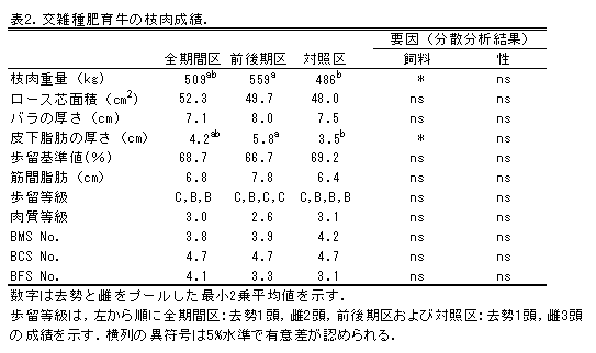 試験開始時の供試頭数は去勢1頭、雌3頭で、雌主体の成績である。 |