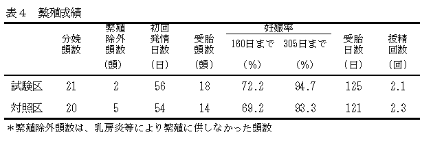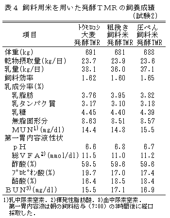粗挽きあるいは蒸気圧ぺんした飼料用米をトウモロコシ、大麦と全量代替しても、トウモロコシと大麦を用いた発酵TMRと同等の飼料摂取量、飼料効率や乳生産が得られる。また、第一胃内発酵や乳中尿素窒素(MUN)および血中尿素窒素(BUN)値は正常で、加工処理した飼料用米の多給によるルーメンアシドーシスや第一胃での窒素と炭水化物の供給量および両者の分解性に問題はない(表4)。 |