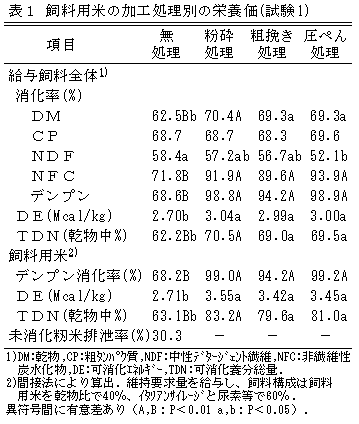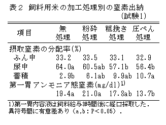 無処理の飼料用米の消化性は極めて低いが、加工処理することでデンプン消化率およびエネルギー価は大きく向上し、尿中窒素排泄率が減少し飼料窒素の利用性が向上する(表1、2)。 |