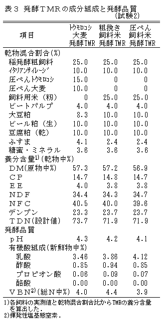無処理と粉砕、粗挽き、蒸気圧ぺんの加工処理をした4種類の飼料用米を籾米で供試し、乾乳牛4頭を用いた窒素出納試験(実証試験1)と、稲発酵粗飼料を25%、圧ぺんトウモロコシと圧ぺん大麦を合計25%混合したTMR、そのトウモロコシと大麦を全量、粗挽き処理または蒸気圧ぺん処理した飼料用米に代替した3種類のTMR(表3)を細断型ロールベーラで発酵TMR調製して供試し、泌乳中期牛6頭を用いた飼養試験(実証試験2)を実施している。なお、供試した稲発酵粗飼料および飼料用米の品種は「ホシアオバ」で、飼料用米の粉砕は、カッティングミルで2mmメッシュを通過させ、粗挽きは、ハンマミルで5mmメッシュを通過させ、蒸気圧ぺんは、90℃の蒸気で10分蒸した後ローラで圧ぺんしたものである。 |