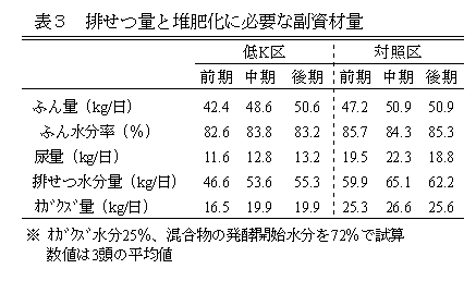 カリウム含量の少ないイネWCSやコーンサイレージを主体とした低カリウムTMR飼料を給与すると、排せつ水分量の削減が可能であり、堆肥化に必要な水分調整材を低減できる。 | ||||||||