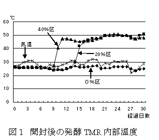 開封後の発酵TMR内部温度は40%混合で10日、20%では15日後から上昇し、二次発酵が認められる(図1)。 |