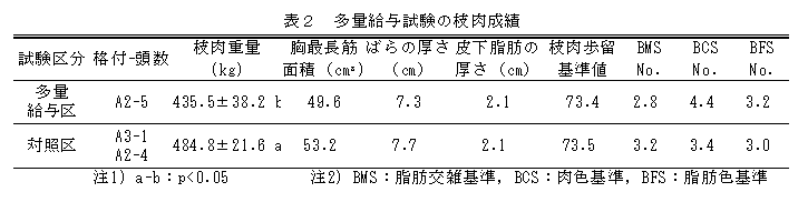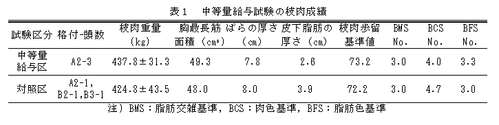 枝肉重量は中等量給与区(437.8kg)が対照区(424.8kg)よりも多い傾向であるのに対し、多量給与区(435.5kg)では試験開始時の体重に差があったこともあり、対照区(484.8kg)よりも有意に少ない。肉質は中等量給与区で対照区と差がないが、多量給与区では脂肪交雑基準が対照区よりやや劣る(表1、2)。 |
