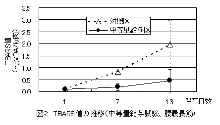 脂質酸化の程度を示すTBARS(2-チオバルビツール酸反応物質)値は、中等量給与試験における腰最長筋の保存13日目で、中等量給与区が0.45mgMDA/kg肉であり対照区の1.98mgMDA/kg肉より低く推移する(図2)。多量給与試験においても、多量給与区の腰最長筋はTBARS値が低く推移するが、半腱様筋では多量給与区のTBARS値が対照区より低いものの、腰最長筋よりも高い水準で推移する(多量給与区1.68mgMDA/kg肉、対照区2.10mgMDA/kg肉、13日目)。 |
