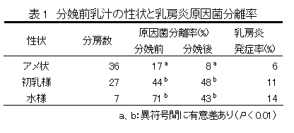 分娩後の臨床型乳房炎発症率は水様14%、初乳様11%、アメ状6%であるが、有意差は認められない(表1)。 |
