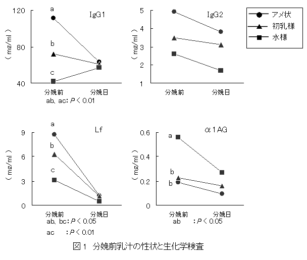 分娩前の乳中IgG1およびLf濃度はアメ状、初乳様、水様の順に高く、逆に急性炎症の指標であるα1AGは水様で最も高く、アメ状で最も低い(図1)。 |