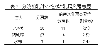 前産次の乳房炎罹患歴と乳汁性状に関連は認められない(表2)。 |