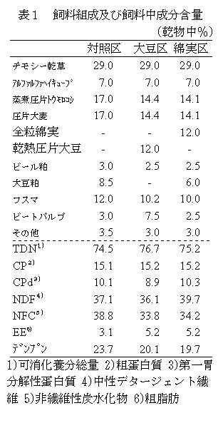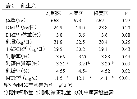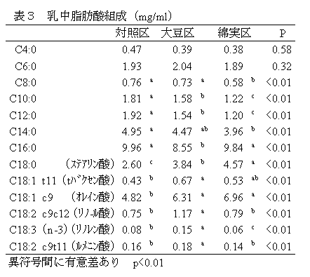 泌乳中期の乳牛の飼料に乾熱圧片大豆を12%添加し、粗脂肪含量を5%程度とすることで、乳生産に支障をきたすことなく乳中機能性脂質が高まる。 | ||||||||||