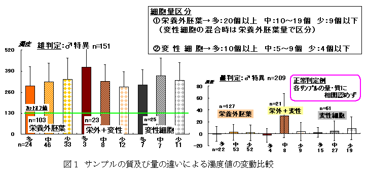 雄雌が明確に判別され、性が一致する子牛も得られている正常な増幅反応群の濁度値は、サンプル量の多少(図1の細胞量区分参照)に比例せず、変性細胞利用等、質の違いによる値の差異や相関も認められない(図1)。 |