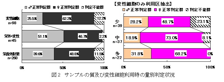 また、変性細胞のみ利用区を抽出し、利用した量別に判定状況を比較すると、判定不能群は少量の変性細胞利用例の割合が高くなる(図2)。 |