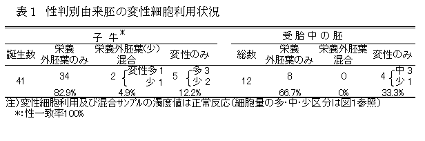 バイオプシー操作時に、胚への損傷低減を図る目的で変性細胞を利用して性判別を実施し、濁度値が正常値を示す場合、判定どおりの性を持つ子牛生産が可能である(表1)。 |