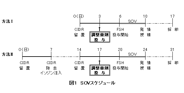 SOVは2つの方法で行う(図1)。方法Ⅰは主に連続SOVに用い、発情周期にかかわらず腟内留置型黄体ホルモン製剤(以下CIDR)挿入6日後から卵胞刺激ホルモン(以下FSH)を4日間で総量13アーマー漸減投与する。発情確認後、凍結精液ストロー1本を用いて人工授精し、同時に排卵促進剤を投与する。採卵は発情から7日目に子宮還流法により実施する。方法Ⅱは主に分娩後初回SOVに用いるが、方法Ⅰの前処理としてCIDRの1週間留置と除去時にイソジンの子宮内注入を組合わせる。なお、前処理は分娩から30日以降に開始する。 |