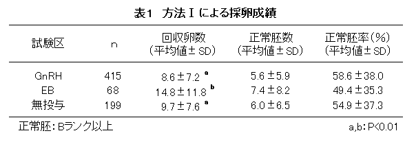 以上から、EBの投与は、方法Ⅰで回収卵数の増加に有効である。また方法Ⅱにおいては調整薬剤投与の有効性が推察される。 |