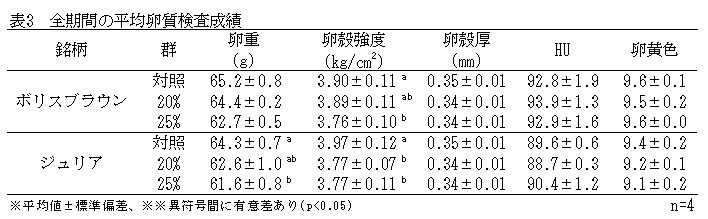 弁当のおかず、惣菜などの高タンパク質・高脂質素材(H、CP22.5%、EE24.7%)、ご飯、パンなど低タンパク質・低脂質素材(L、CP9.2%、EE4.5%)を加熱乾燥処理したものを飼料原料とする。配合割合はH0%・L0%(対照区)、H20%・L10%(20%区)、H25%・L5%(25%区)である。ジュリアとボリスブラウンをそれぞれ144羽用い12羽×4反復/群の3群を設け、141日齢から給与を開始し、4週間を1期間として成績を取りまとめる。 | ||||||||||