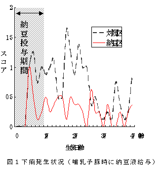 安全安心な豚肉を消費者に提供するためには、抗菌性物質などの薬剤に頼らない生産技術が求められていることから、子豚の下痢が多発する農場において、納豆の投与は有効であると推定される。 |
