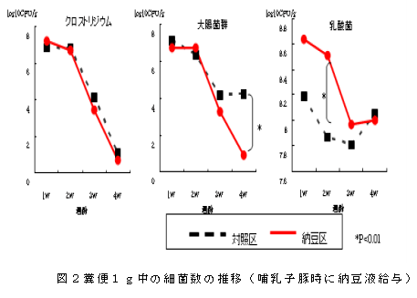 哺乳子豚に納豆液を投与すると、納豆投与を終了した1週齢以降、有意に良好な体重増加を示す(表1)。これは、図1のとおり納豆給与区でも生後約1週間までは下痢が観察されるが、それ以降は軟便や下痢の発生が少なくなり、その症状も軽く同腹内全体に波及しないことによると推定される(糞便スコアは糞便性状等により0~4に区分:0、1を正常とする)。さらに、糞便中の細菌検査で(図2)、クロストリジウムに差は見られないが、大腸菌群数は4週齢で対照区と比較して納豆区が有意に少なくなり、乳酸菌数は2週齢では納豆区で有意に多くなる。以上のことから、哺乳子豚の細菌性下痢に納豆の投与は有効であると推定される。 |