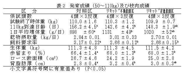 枝肉成績については、歩留まりはリキッドフィード不断及び定量給餌がマッシュ飼料不断給餌に比べ、優れる。また、背脂肪厚はリキッドフィード不断給餌がマッシュ飼料不断給餌に比べ、厚くなるが、リキッド飼料を定量給餌すると厚脂が低減する(表2)。 |