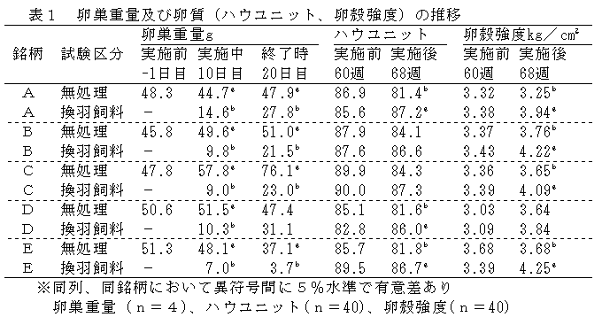 産卵後期(60週齢)の白色レグホーン市販5銘柄に、粉砕もみ殻を約30%配合したふすま主体換羽飼料を不断給餌で21日間給与することにより休産させ、休産後の卵質を改善することができる。 | ||||||||