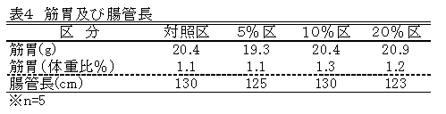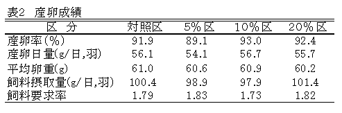 産卵鶏に成鶏配合飼料の5~20%を飼料用米に長期間置き換えて給与しても産卵成績に影響はないが、飼料用米の添加量に比例して卵殻質が低下し、卵黄色はわずかに薄くなる。 | ||||||||||