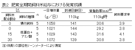 肥育後期に、飼料米を15%配合した低蛋白質アミノ酸添加飼料を給与したところ、発育及び窒素排泄量は、トウモロコシを主体とした低蛋白質アミノ酸添加飼料と同等であり、生産性を維持しつつ環境への負荷が軽減されるとともに、皮下脂肪内層の脂肪酸組成も変化する。 |